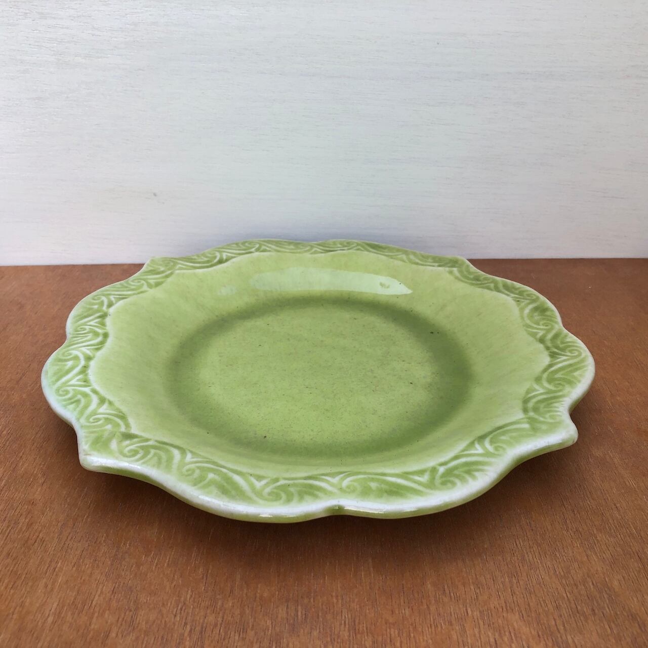 縁のカタチが印象的な緑釉のお皿です。メイン料理のお皿としても、パスタやカレーなどのお料理にもいかがでしょう?
