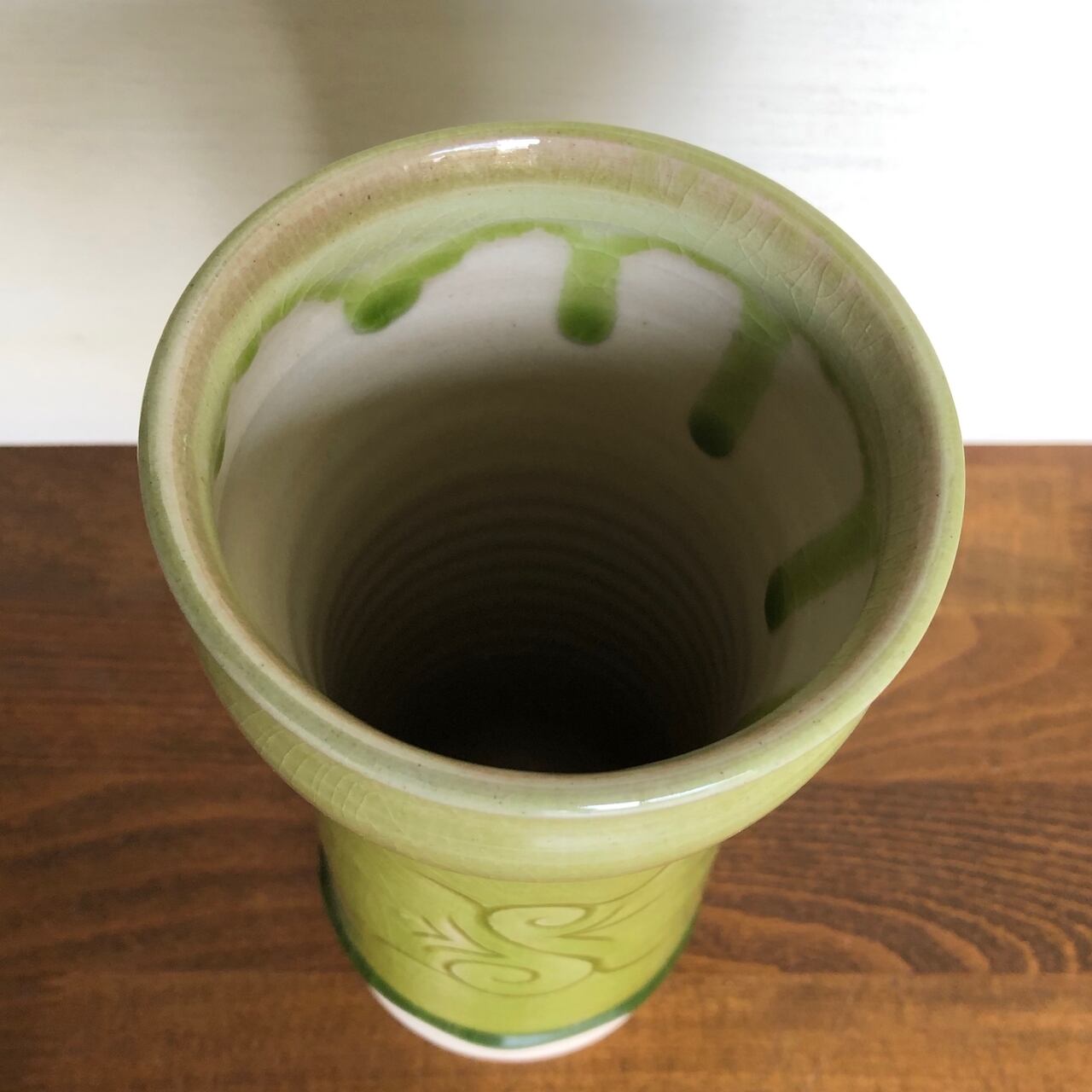 明るい緑釉をかけた花器です。細身なので、少ない花でも収まりがいいと思います。