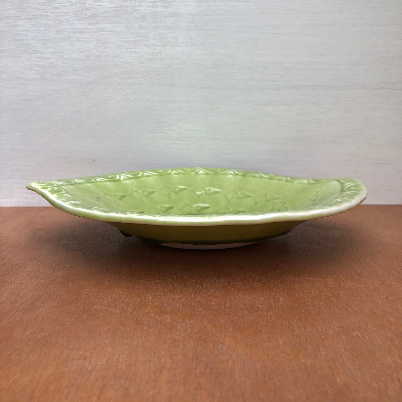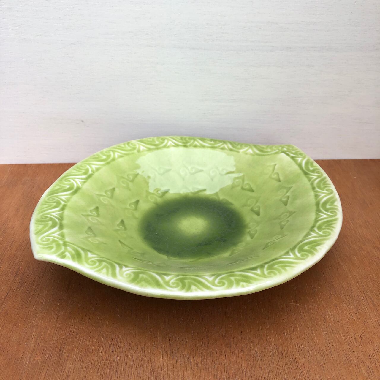 内側全面に印文を施した緑釉の浅めの鉢です。底面が狭いので、少量の料理を盛っても映えますし、たっぷりのお料理でも大丈夫です。