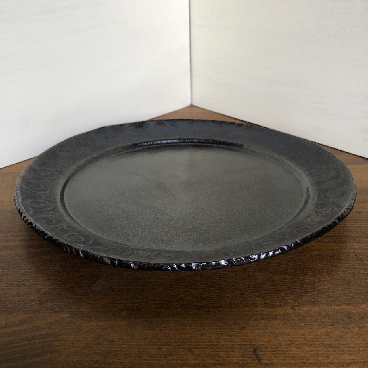 縁にだけブロンズ釉を塗ることで質感が少し違ってアクセントになっています。大きめの皿ですので、盛り付けもいろいろ楽しんで頂けたらと思います。