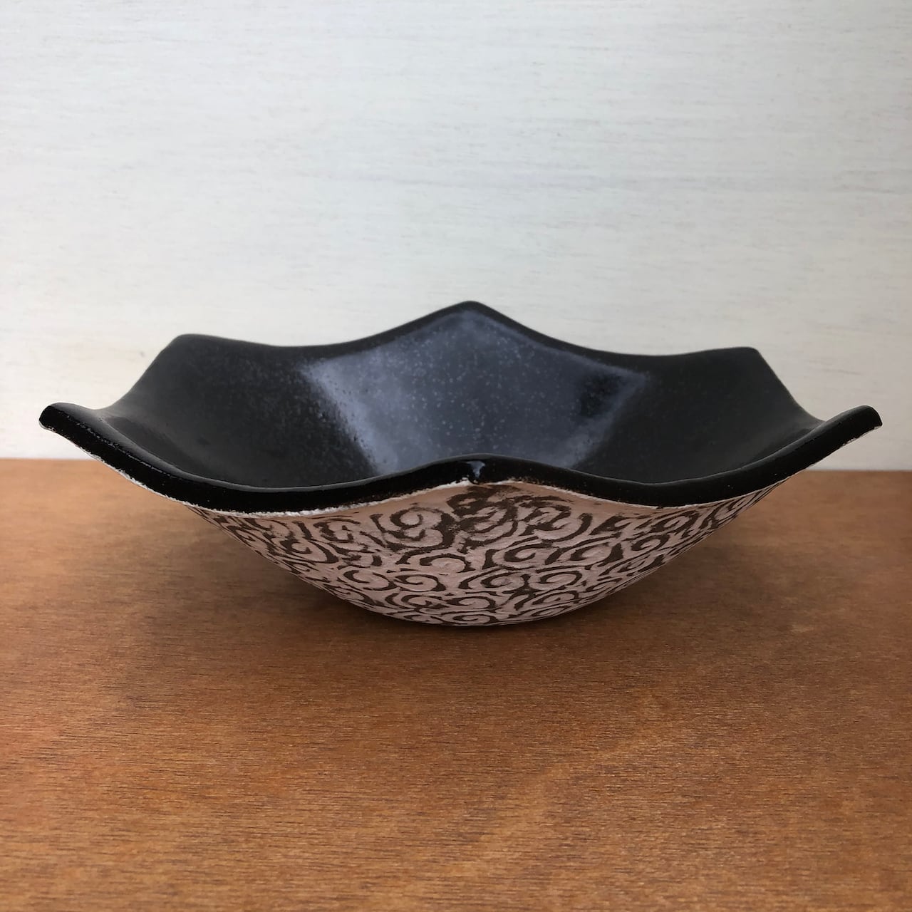 外側に印文を施し、白土を埋め込んでいます。内側は黒い釉を掛けていますので、お手入れしやすいと思います。